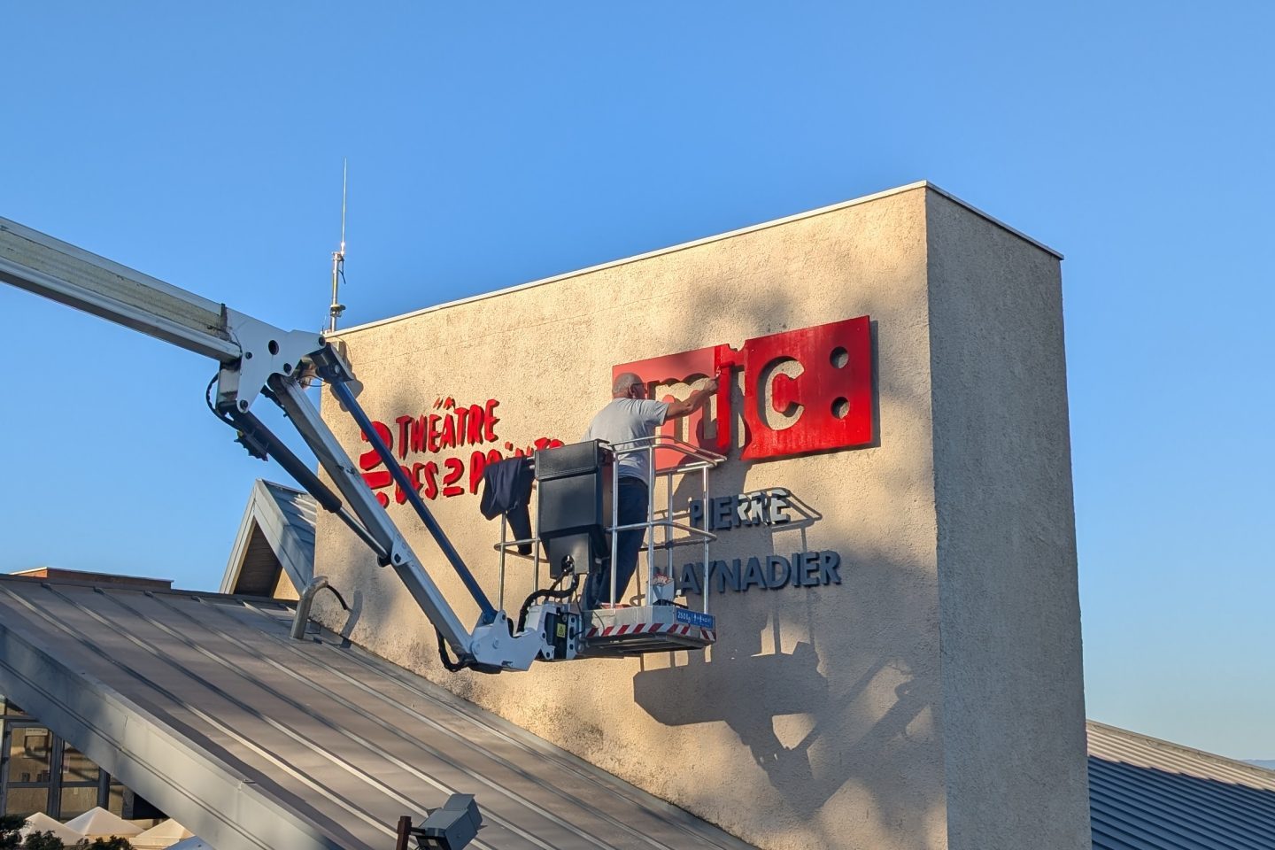 Le Théâtre des 2 Points de la MJC de Rodez affiche fièrement sa nouvelle enseigne ! Installée ce lundi 6 octobre après-midi, elle vient donner une nouvelle visibilité au théâtre et concrétise le travail de refonte de son identité visuelle engagé depuis le début de l’année.