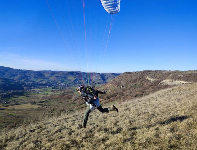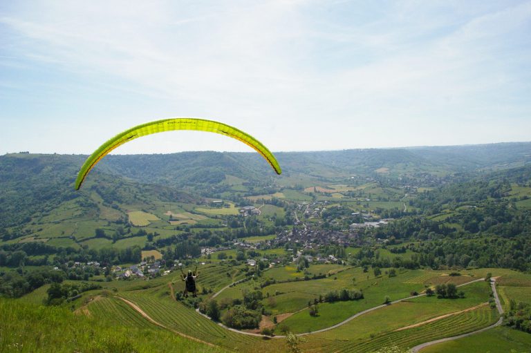 Le principe : transporter son matériel de vol à pied jusqu’au site de décollage, puis s’élancer dans les airs pour profiter des paysages aveyronnais.